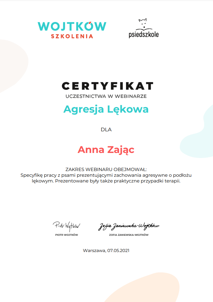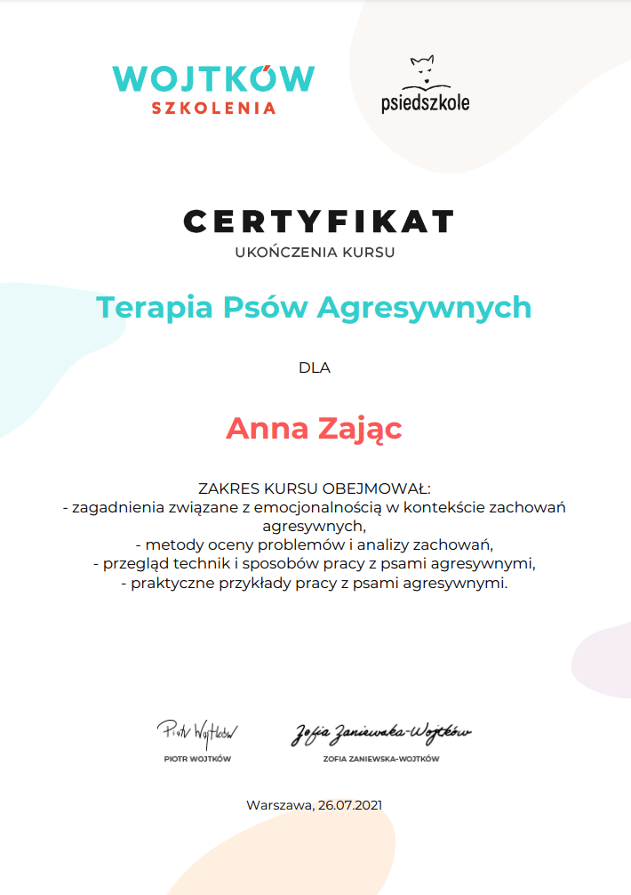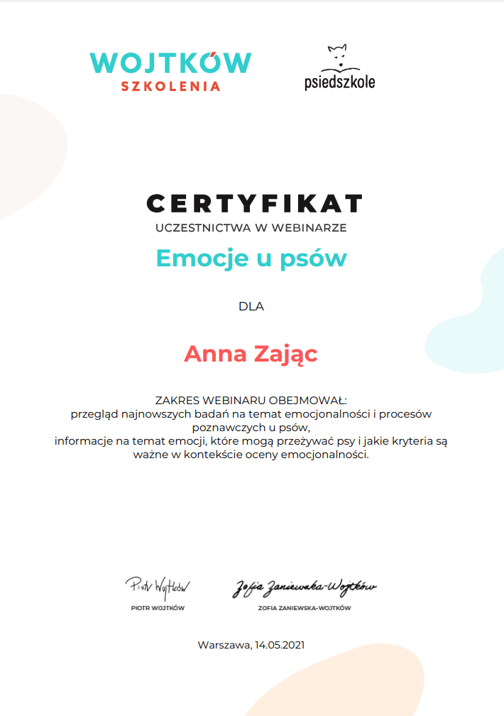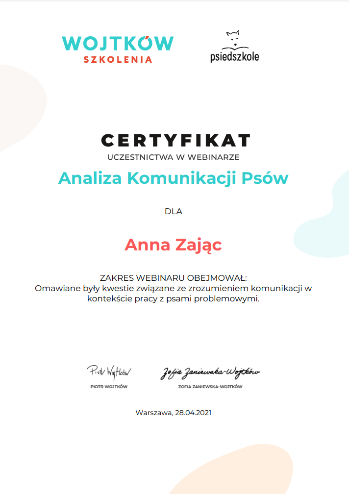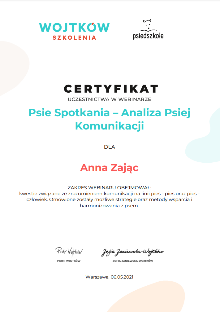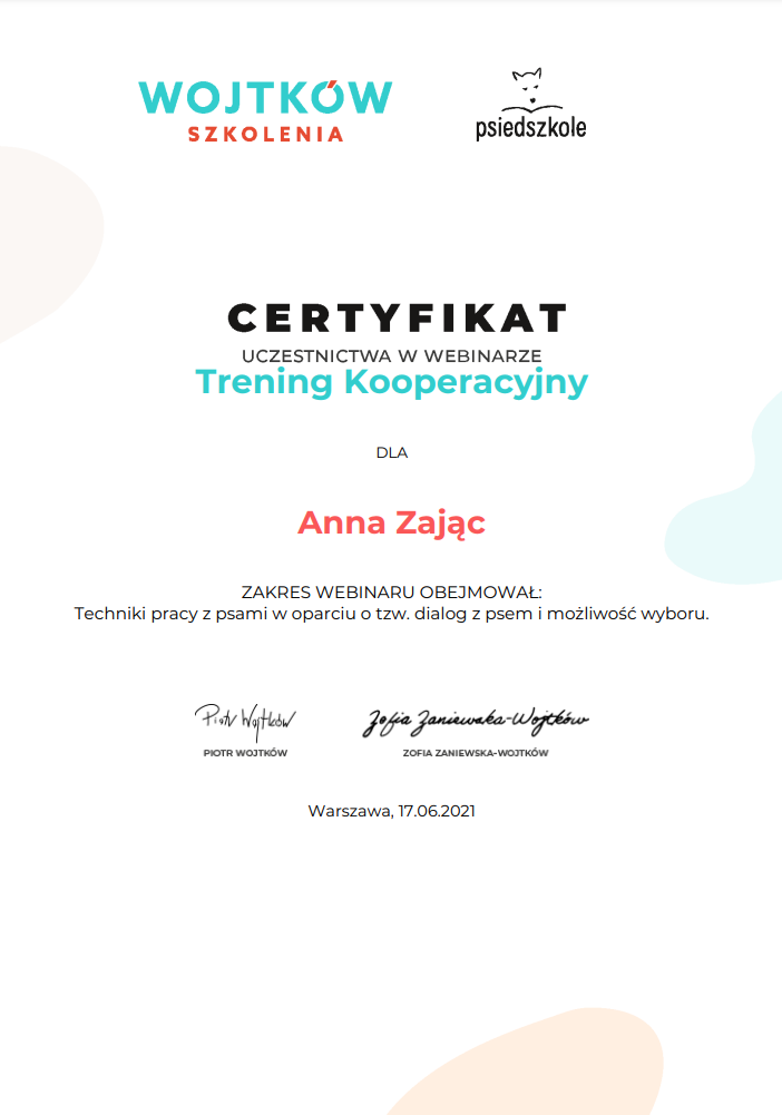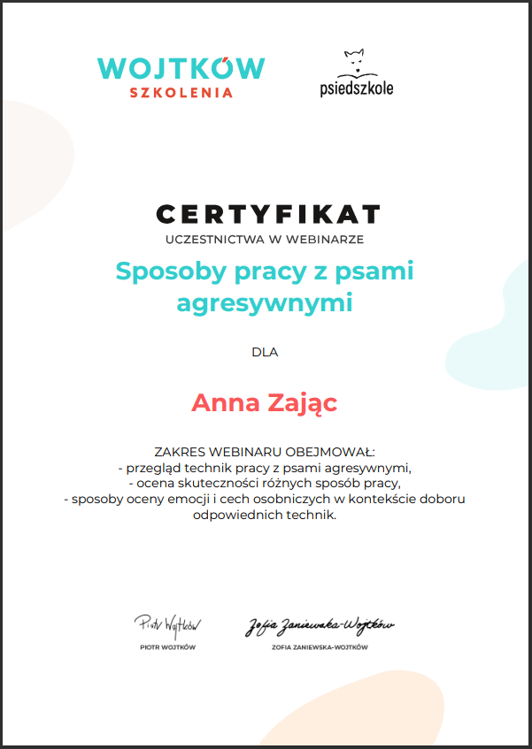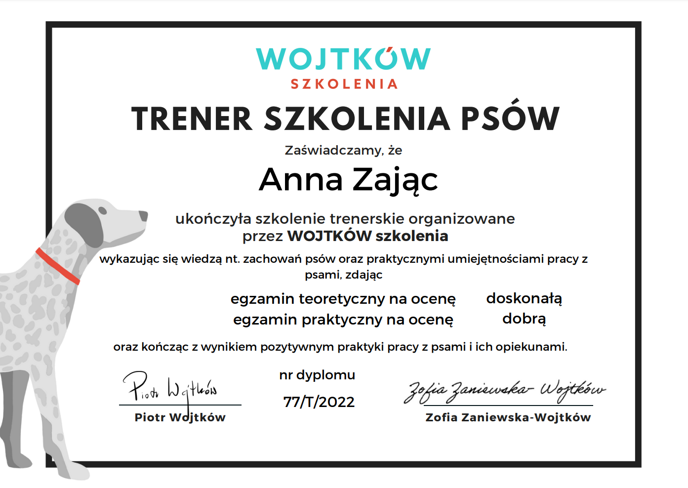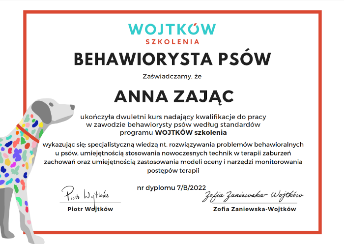 Nazywam się Ania Porębska (Zając) i jestem certyfikowanym trenerem oraz behawiorystą. Moja praca to połączenie pasji, wiedzy i doświadczenia – pomagam opiekunom psów zrozumieć potrzeby swoich pupili i budować z nimi silne, oparte na zaufaniu relacje.