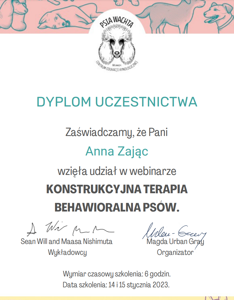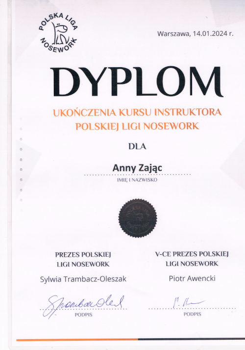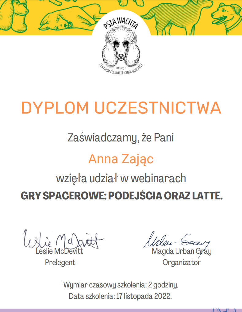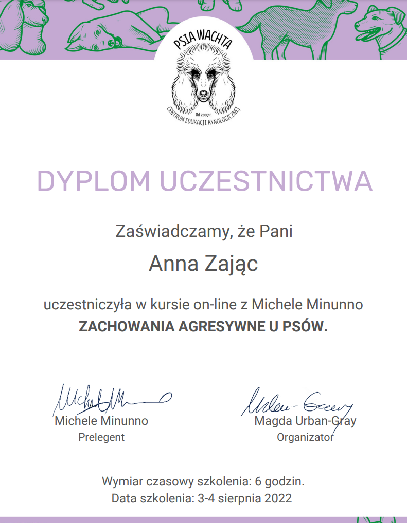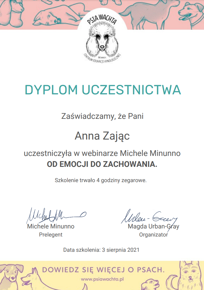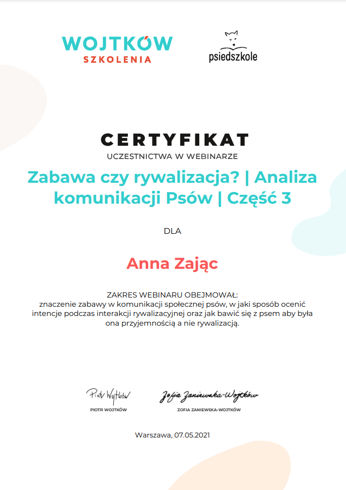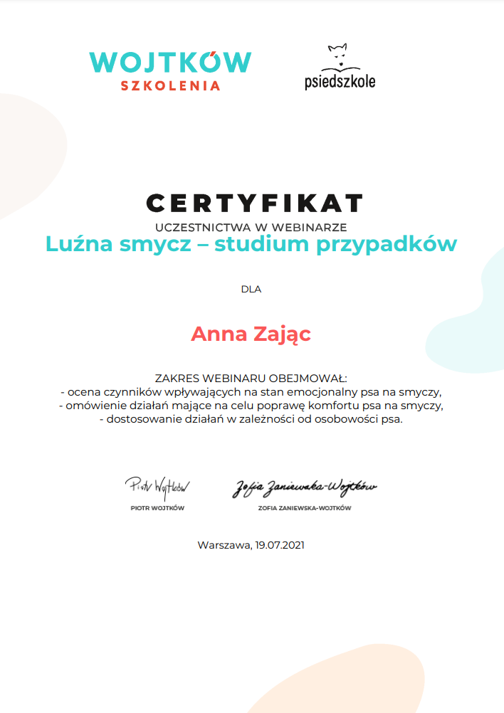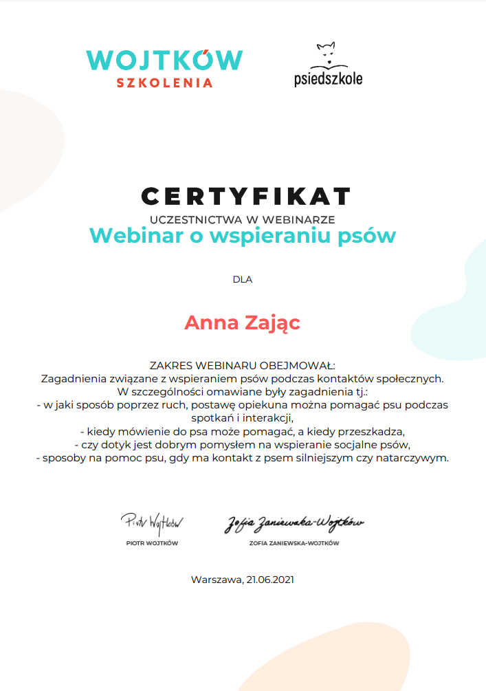 Nazywam się Ania Porębska (Zając) i jestem certyfikowanym trenerem oraz behawiorystą. Moja praca to połączenie pasji, wiedzy i doświadczenia – pomagam opiekunom psów zrozumieć potrzeby swoich pupili i budować z nimi silne, oparte na zaufaniu relacje.
